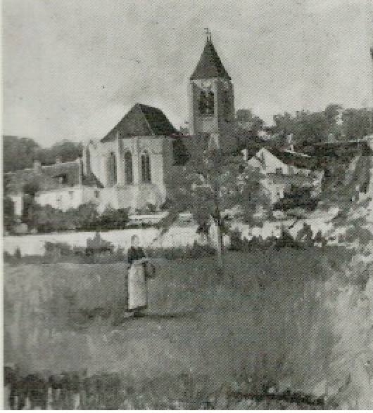 La photo ci-dessous est explicite. Seule une vue rapprochée a été possible, car le grand champ où figure une paysanne portant un panier, n’existe plus. Tout un quartier de maisons a été construit, ce qui empêche tout recul pour prendre la photographie de l’église.